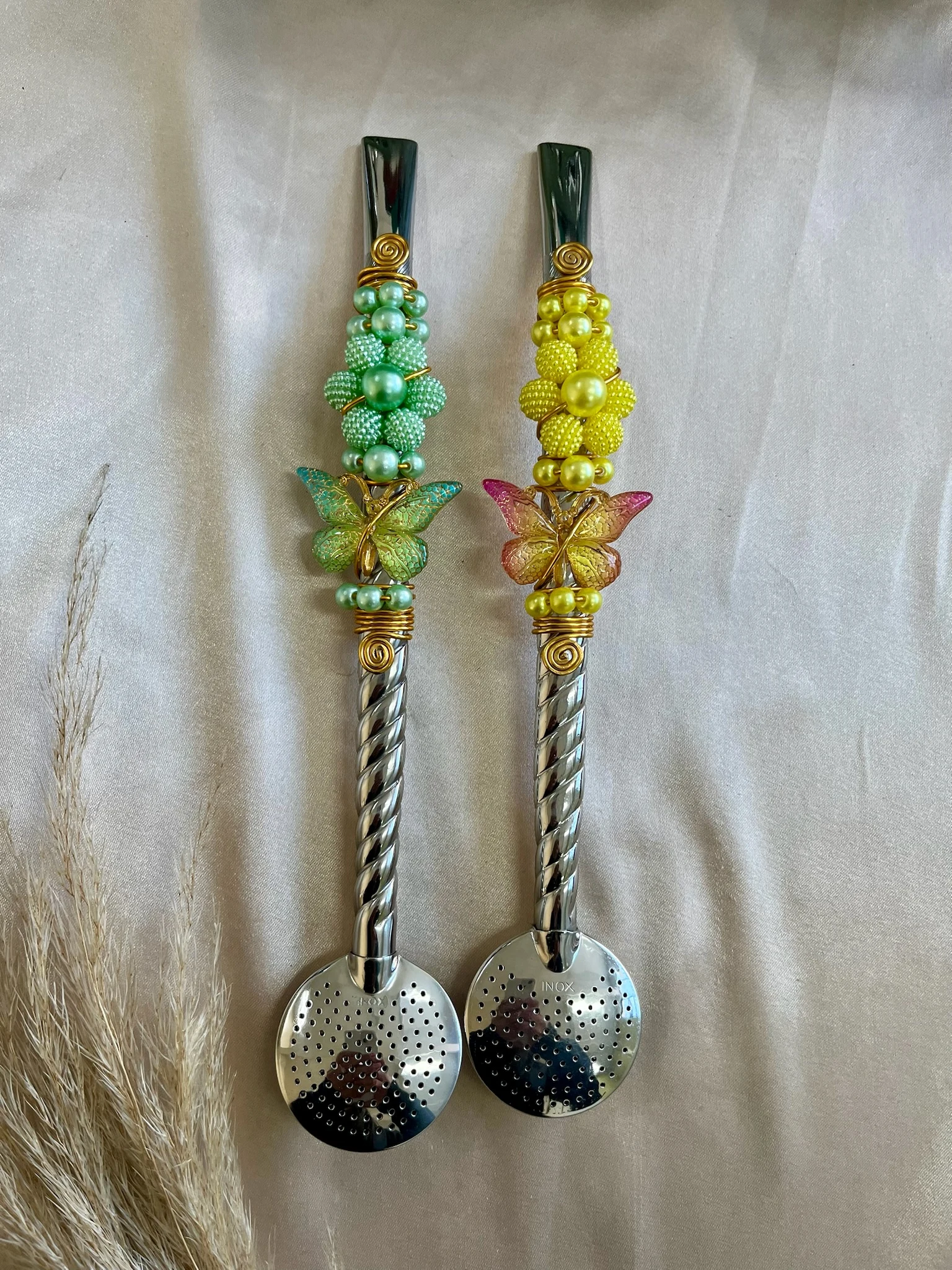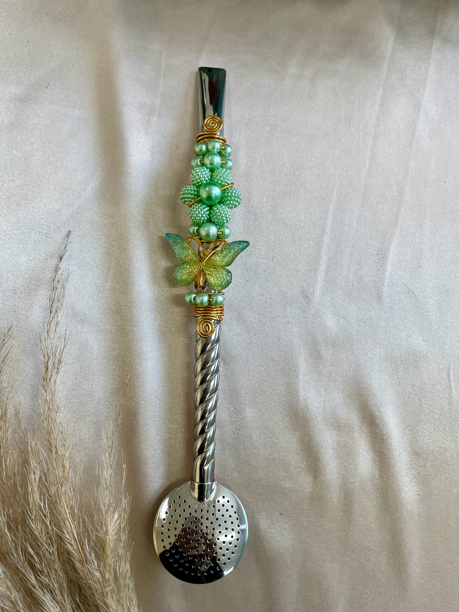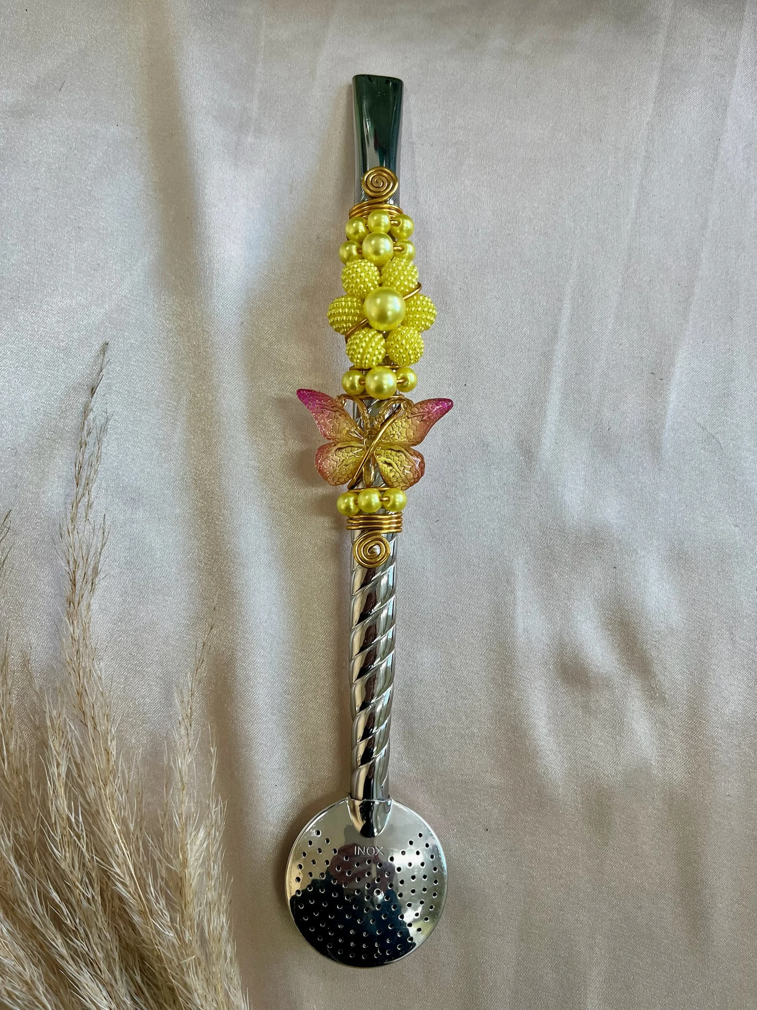 O trançado artesanal junto aos detalhes em pérola e borboleta tornam essa bomba uma das mais elegantes da coleção, perfeita para quem quer unir beleza, qualidade e tradição no momento do mate.
