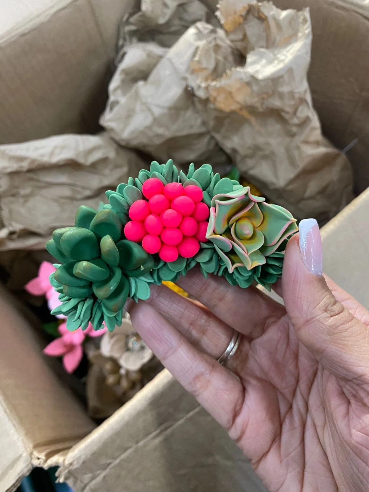 Cada peça é única, com variações de cores e tipos de flores, criando um visual alegre, colorido e cheio de vida.